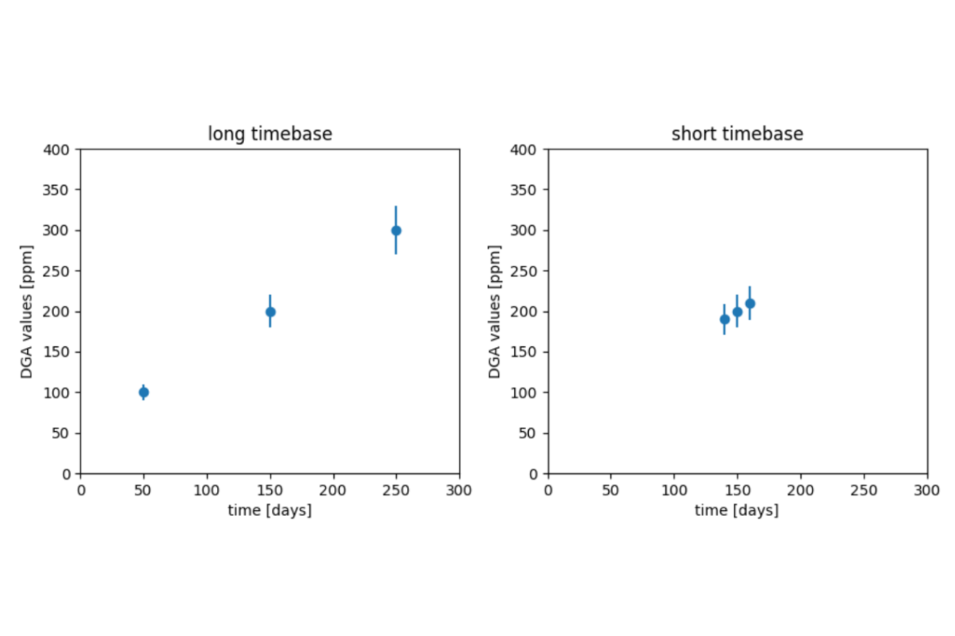 Praktischer Nebeneffekt: Wenn ein Transformator jährlich im Labor geprüft wird, werden immer mindestens 3 Datenpunkte für die Zeitspanne von 24 Monaten direkt nach der letzten Messung verfügbar sein. 365 Tage zwischen den Messungen dürfen aber nie überschritten werden, und Ausreißer dürfen nicht auftreten, damit dieses Schema funktioniert.